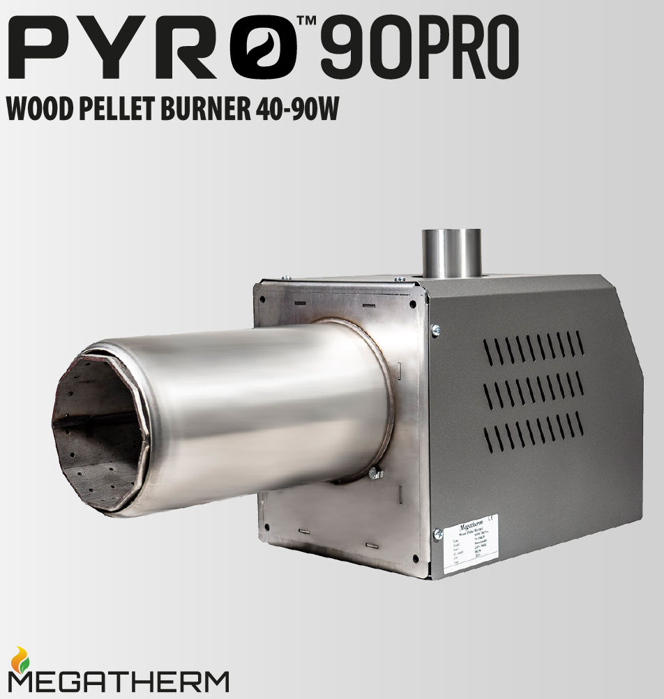 Megatherm Pyro 90 kW, suruõhuga puhastamise valmidus. Komplektis on põleti, kontroller REG-03 ja etteandetigu 1,5 m.