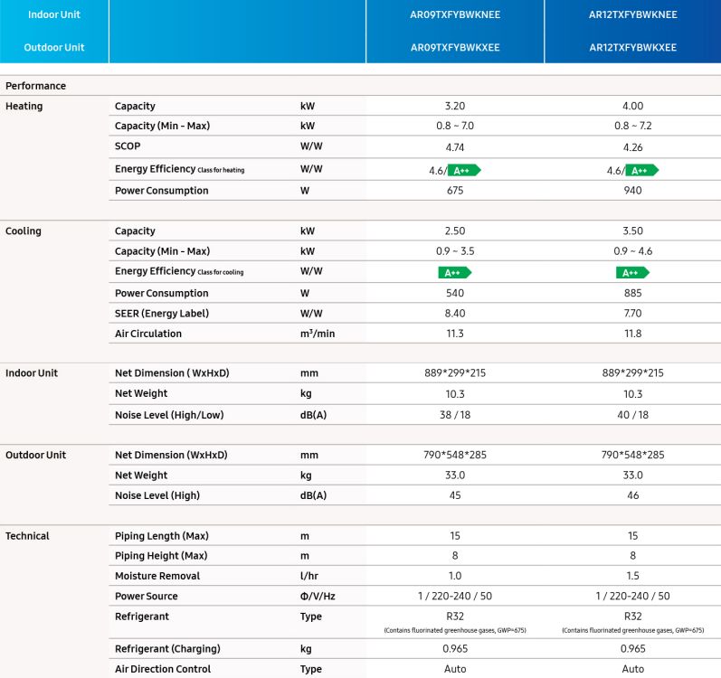 3,2 (0,8 - 7,0) kW, AR09TXFYBWKNEE + AR09TXFYBWKXEE, R32, Wifi
